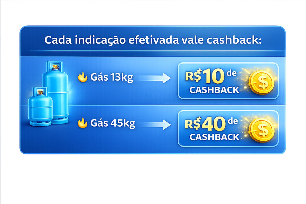 Indique clientes, ganhe cashback e use em desconto na compra de seu gás ou receba PIX de R$ 100,00